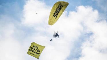 Nach dem Ausflugsprogramm stehen am heutigen Dienstag Beratungsgespräche der EU-Agrarminister*innen an. Auch dieses Treffen in der Rhein-Mosel-Halle in Koblenz nutzen die Aktivist*innen, um ihren Forderungen Nachdruck zu verleihen - diesmal aus der Luft: Ein Aktivist fliegt in großen Bögen in einem Gleitschirm über das Gebäude. Seine Botschaft ist weithin sichtbar: “Kein Geld für gestern”. Landwirt*innen, die das EU-Treffen ebenfalls für ihren Protest nutzen, werden aufmerksam und kommen mit den Aktivist*innen ins Gespräch. Denn die anstehende Reform der GAP beschäftigt auch sie.