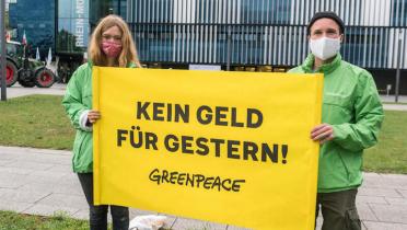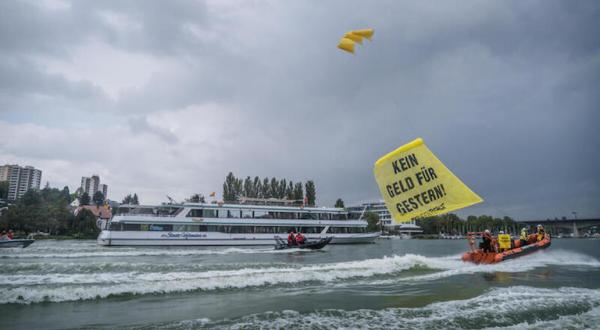 Eine Exkursion in den Weinberg und anschließend eine Fahrt mit dem Schiff über die idyllische Mosel. Landwirtschaftsministerin Julia Klöckner (CDU) zeigt ihren europäischen Kolleg*innen am zweiten Tag des informellen Treffens der EU-Agrarminister*innen die schönen Seiten ihrer Heimat. Eine Bootsfahrt, die ist lustig? Gar nicht lustig finden Aktivistinnen und Aktivisten von Greenpeace jedoch den klimaschädlichen Kurs der europäischen Agrarpolitik. Während die Politiker*innen mit dem Schiff von Winningen nach Koblenz fahren, werden sie von drei Greenpeace-Schlauchbooten begleitet. “Kein Geld für gestern” prangt auf einem Banner, das dabei an einem Flugdrachen aufsteigt. Drei weitere Aktivist*innen empfangen das Schiff in Koblenz in ihren Kajaks. Sie fordern von Julia Klöckner, sich für eine klimaschonende Politik einzusetzen.