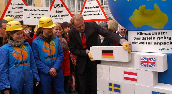 Greenpeace-Jugendliche mit dem damailgen Umweltminister Trittin am Tag der Ratifizierung des Kyoto-Protokolls, Februar 2005.