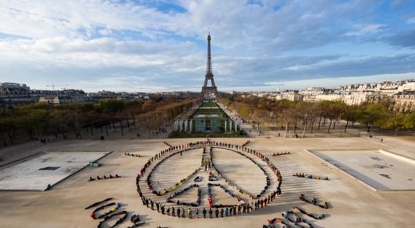 Hunderte Menschen bilden visuelle Klimaschutzbotschaft am Eiffelturm in Paris