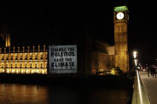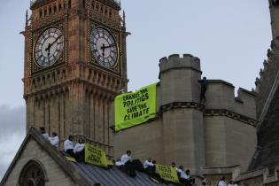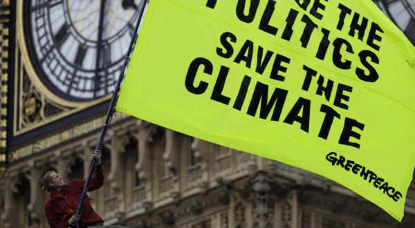 Ändert die Politik, Rettet das Klima, steht auf einem Banner. Auf der Tagesordnung der ersten Sitzung nach der parlamentarischen Sommerpause steht heute auch die Abstimmung eines Klimaprogramms. Greenpeace hat den Abgeordneten deshalb in einem Manifest zwölf einfache Schritte aufgelistet, denen die Parlamentarier noch heute zustimmen können, um Großbritannien zügig auf einen Weg der Emissionsminderung zu bringen und Entwicklungsländer bei der Entwicklung erneuerbarer Energien zu unterstützen.