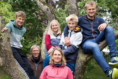 Hannes, Sophie, Jakob und Paul Backsen mit ihren Eltern auf dem Pellwormer Bio-Hof der Familie.