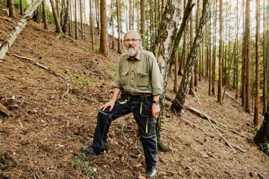 Johannes Paul hat seine Hütte am Rande des Nationalparks in Ottendorf verlassen und führt uns durch ein angrenzendes Waldgebiet. Die Trockenheit ist auch hier omnipräsent; und besonders Fichten leiden unter der Klimakrise. Großflächig haben sich einst dunkelgrüne Bäume in Baumfriedhöfe voll dürrer, brauner Skelette verwandelt. Trockene und heiße Sommer wie dieser machen die Bäume zudem anfällig für Borkenkäferattacken.