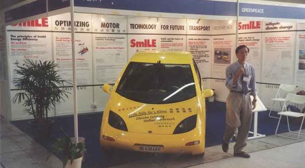 Shanghai, Juni 1997: Greenpeace präsentiert das gelbe Sparmobil auf einer der größten Automessen Chinas. Der SmILE ist ständig von einer Menschentraube umringt, und die Mitarbeiter aus dem Hongkonger Greenpeace-Büro reden und erklären ohne Pause. Das Hauptinteresse richtet sich auf den in China völlig unbekannten Druckwellenlader.
