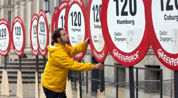 Ein Tempolimit könnte die Treibhausgase schnell verringern. Deshalb hat Greenpeace schon seit April auf Autobahn-Teilstücken Tempo-120-Schilder aufgestellt. In sechs Bundesländern auf insgesamt 120 Autobahn-Kilometern wurde eine Geschwindigkeitsbeschränkung für den Klimaschutz eingeführt.