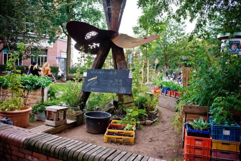 Leute pflanzen Blumen und Gemüse an öffentlichen Plätzen und Gärten in Hamburg Wilhelmsburg.