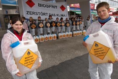 Den Zusammenhang zwischen Agrotreibstoff und der Hungerkrise verdeutlichten die Aktivistinnen und Aktivisten in Berlin mit Hilfe eines Mercedes-Geländewagens. Ein nur mit Agrosprit betanktes Auto mit 13 Liter Verbrauch verschlingt alle zwei Kilometer ein Brot. Denn aus 100 Kilogramm Weizen lassen sich entweder 100 Brote backen oder rund 40 Liter Ethanol herstellen.
