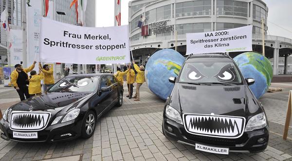 Glaubt man den Autoherstellern, brechen auf unseren Straßen demnächst grüne Zeiten aus. Auf der Internationalen Automobil Austellung (IAA) in Frankfurt steht bei fast jeder großen Marke eine Studie für ein Elektroauto auf dem Messestand. Doch die grünen Zukunftsvisionen der Marketingabteilungen lenken vom eigentlichen Problem ab. Die Flottenverbräuche deutscher Automobilhersteller sind immer noch zu hoch und die Fahrzeuge produzieren zu viel klimaschädliche Gase. Greenpeace-Aktive protestierten am 17.9.2009, bei der offiziellen Eröffnung der IAA gegen die verfehlte Modellpolitik der Hersteller und forderte Bundeskanzlerin Angela Merkel (CDU) auf, die Spritfresser aus deutscher Produktion endlich zu stoppen.