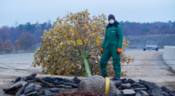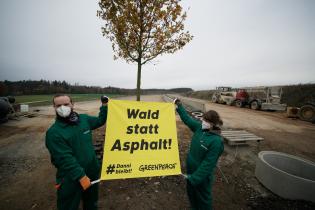 Eine acht Meter hohe Stieleiche, gepflanzt im Endstück der A49: Damit haben Greenpeace-Aktivistinnen und Aktivisten heute früh gegen den Ausbau der umstrittenen Autobahn durch den Dannenröder Wald demonstriert. Mit ihrem Slogan “Wald statt Asphalt” fordern sie eine neue Verkehrsplanung, die weder Natur zerstört noch die Klimakrise anheizt. “Statt einen gesunden Wald abzuholzen, um eine Verkehrspolitik von gestern zu zementieren, braucht es einen sofortigen Ausbaustopp aller geplanten Autobahnen”, sagt Greenpeace-Klimaexperte Benjamin Stephan. “Wälder können uns helfen, die Erderhitzung zu bremsen - weitere Autobahnen werden sie beschleunigen.”