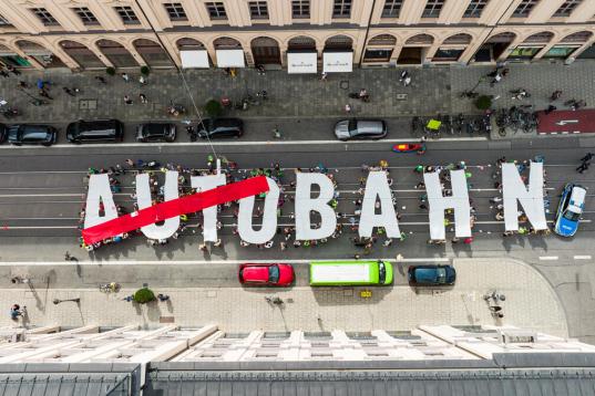 Foto von oben auf Menschen, die Buchstaben hochhalten: AUTOBAHN - das Wort Auto ist durchgestrichen