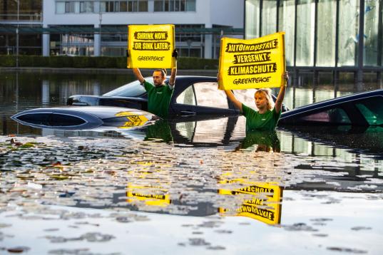 Gegen dieses Geschäftsmodell demonstrieren Greenpeace-Aktivist:innen am 4. September vor dem Eingang der IAA in München. In einem großen Wasserbecken vor der Messe haben sie drei Autodächer unterschiedlich tief versenkt. „Autoindustrie versenkt Klimaschutz“ und „Shrink Now Or Sink Later“ (Jetzt schrumpfen oder später untergehen) steht auf den Bannern.