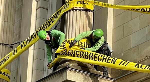 Dieser Auffassung sind auch Greenpeace-Kletter:innen, die heute Morgen an der Fassade des Verkehrsministeriums zwei je 40 Meter lange Absperrbänder mit der Aufschrift „Klimaverbrechen“ gespannt haben. An der Stelle, an der sich das Büro von Verkehrsminister Volker Wissing (FDP) befindet. Was zu tun ist, klebten die Aktiven in Form eines Aufgabenzettels an die Fensterscheibe.