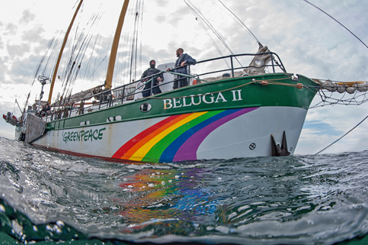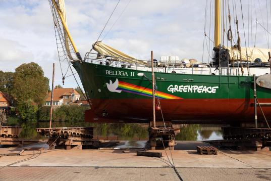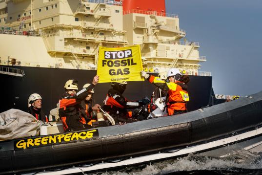 An Bord des Greenpeace-Schiffs Arctic Sunrise und in zwei Schlauchbooten protestierten Aktivist:innen von Greenpeace vor zwei LNG-Tankern, die Gas aus den USA bzw. aus Russland nach Belgien bringen. Sie kritisieren die anhaltende Abhängigkeit Europas von fossilen Gasimporten (03/2025).
