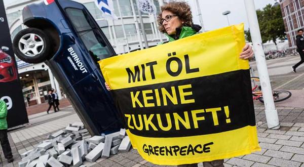 Dabei wird immer deutlicher: Der Verbrennungsmotor ist am Ende. „Burnout“ steht deshalb auf dem VW-Touareg, den Greenpeace-Aktivisten vor dem Ausstellungsgelände geparkt haben: Er steckt mit der Kühlerhaube voran schräg im Boden. Der Qualm aus dem Auspuff des SUVs symbolisiert, weshalb Autos wie dieses keine Zukunft haben: CO2-Emissionen belasten das Klima, Stickoxide die Stadtluft. „Der Verkehr muss schon sehr bald ohne Öl auskommen“, sagt Andree Böhling, Greenpeace-Experte für Mobilität. „Die Autoindustrie muss endlich einen ernsthaften Beitrag zum Klimaschutz leisten. Wir brauchen eine Verkehrswende hin zu sauberen, leichteren und gemeinsam genutzten E-Autos.“