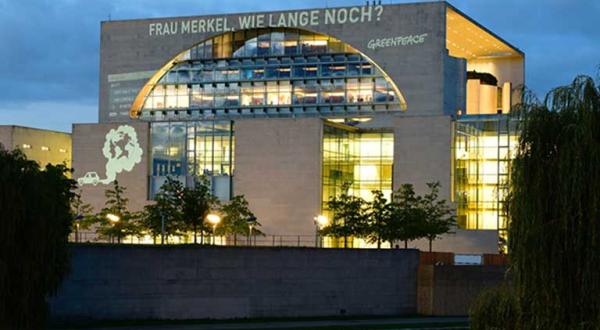 „Frau Merkel, wie lange noch?“, fragten Greenpeace-Aktivisten deshalb heute in den frühen Morgenstunden mit einer Projektion ans Bundeskanzleramt. Unter dem Schriftzug an der Fassade schimmerte eine in Autoabgase gehüllte Erdkugel. Die Aktivisten fordern einen Kurswechsel in der Verkehrspolitik. „Kanzlerin Merkel sollte den Menschen vor der Wahl sagen, wann Deutschland aus dem Verbrennungsmotor aussteigen soll, sonst ist ihre Positionierung wertlos“, so Böhling.