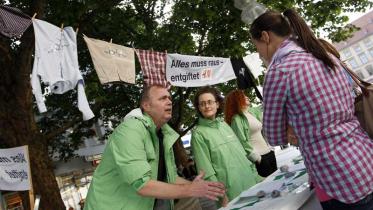 Zum anderen üben die Greenpaece-Aktivitäten in Deutschland - aber auch in anderen Ländern - zum Beispiel vor den H&M-Läden wirklich großen Druck aus. Das mögen die Firmen nicht. Die wollen nicht, dass wir die Konsumenten vor den Läden ansprechen.