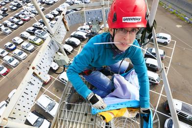 An einem der größten Umschlaghäfen Großbritanniens protestieren Greenpeace-Aktivisten heute gegen eine schmutzige Lieferung: Diesel-Pkw aus Deutschland.