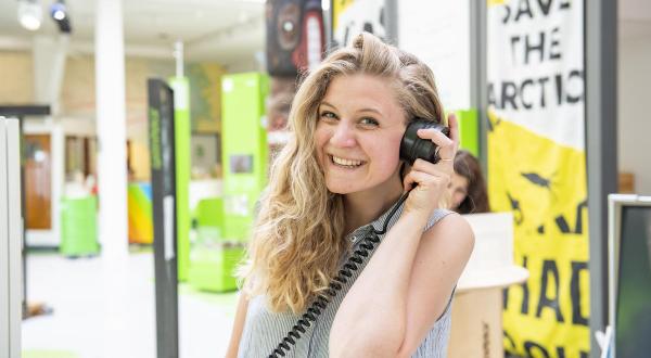 Eine Frau steht lächelnd in der Greenpeace-Ausstellung und hört sich etwas an.