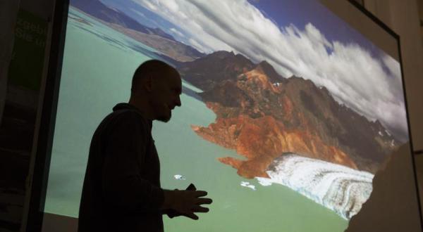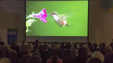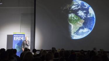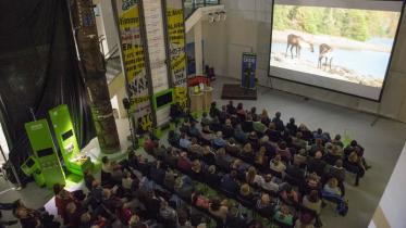 Eine riesige Leinwand ist im Foyer der Greenpeace-Zentrale aufgebaut, davor ein Mann mit Mikrofon und 120 erwartungsvolle Menschen. Der Naturfotograf Markus Mauthe ist mit seiner Multivisionsshow „Naturwunder Erde“ schon in vielen Orten in Deutschland zu Gast gewesen – doch die Präsentation seiner farbenprächtigen Bilder von Eis und Schnee, Wüstensand und wilden Tieren direkt bei Greenpeace ist auch für ihn etwas Besonderes: „Ich freue mich, dass ich der Erste bin, der im neuen Greenpeace-Büro einen Vortrag halten und das Atrium somit als Veranstaltungsort einweihen darf.“