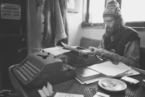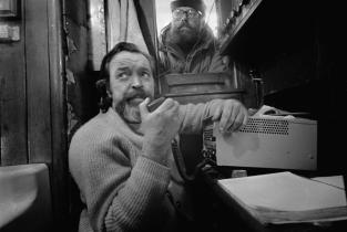 Bob Hunter tippt am Küchentisch Pressemitteilungen, während sich die Phyllis Cormack San Francisco, Küste Kaliforniens, nähert. (Walfangkampagne 1975, Nordpazifik)