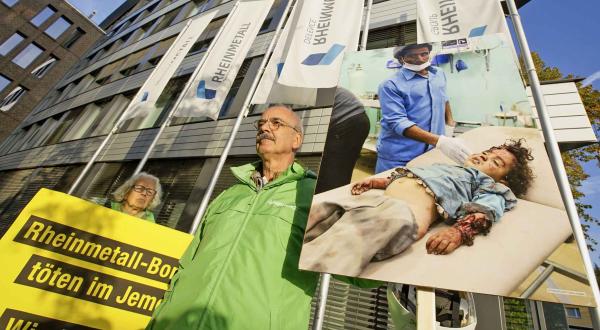 Protest an der Rheinmetall-Zentrale gegen Waffenexporte für den Jemen-Krieg