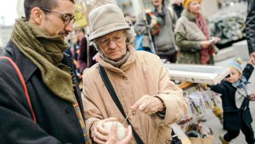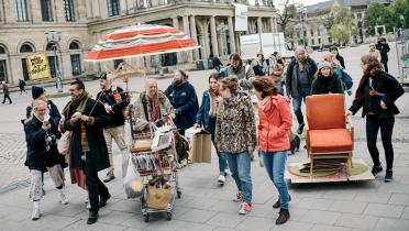 Ja, der Wollator, den wir mit Studierenden entwickelt haben, macht genau das: Der ist laut, der macht Krach, der klingelt und ist bunt. Das ist ein mit Wollspindeln versehener Einkaufswagen, den wir zum Fashion Revolution Day im vergangenen Jahr gebaut haben. Da ist ein Fahrradlenker draufgeschweißt und eine alte Strickmaschine aus den Achtzigern. Und tatsächlich hat genau das geklappt, was wir erreichen wollten: Die Leute sind stehengeblieben. Omas sagten: „Was, damit wollt ihr stricken? Ich zeig euch mal, wie das geht.“ Plötzlich strickten alte Leute und junge Leute gemeinsam an Wollresten. Den Wollator haben wir jetzt schon häufiger präsentiert, und er war immer ein Erfolg.
