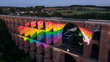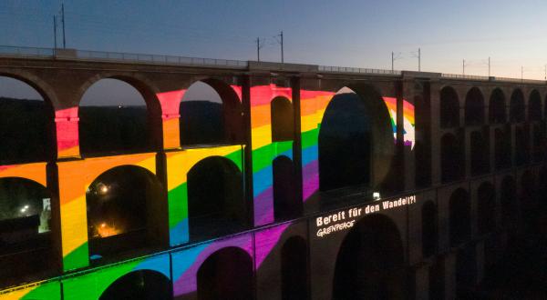 Greenpeace-Aktivist*innen verliehen heute an einem ikonischen Bauwerk ihrer Hoffnung Ausdruck, dass die Welt nach Corona tatsächlich besser und lebenswerter sein kann. Auf die 78 Meter hohe Göltzschtalbrücke im sächsischen Vogtlandkreis projizierten sie einen riesigen Regenbogen, inklusive Schriftzug “Bereit für den Wandel!” Der Ort hat Symbolkraft: Als erste statisch berechnete Brücke der Welt gilt das 1851 fertiggestellte Viadukt selbst als Symbol für eine Zeitenwende.