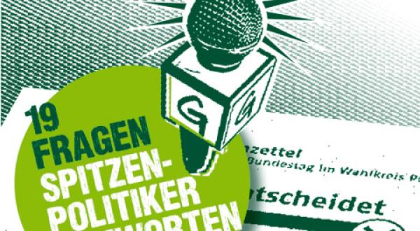Greenpeace hat dafür Spitzenpolitiker der im Bundestag vertretenen Parteien zu zentralen Umweltthemen befragt. Erstmals haben wir dieses Jahr auch Fragen unserer User in unseren Wahlkompass aufgenommen: Unter den vielen Vorschlägen, die wir über unsere Online-Umfrage erhielten, haben die Internet-Nutzer fünf "Bürgerfragen" ausgewählt.
