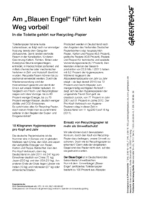 Während die Altpapiereinsatzquote in Deutschland zwar grundsätzlich steigt, geht der Anteil von Recyclingfasern bei Hygienepapieren deutlich zurück. Betrug die Quote im Jahr 2001 noch 77 Prozent, so ist sie im letzten Jahr auf 51 Prozent gefallen.
