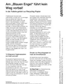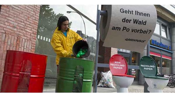 Greenpeace fordert den Einzelhandel auf, nur noch Recyclingpapier mit dem Umweltsiegel "Blauer Engel" zum Verkauf anzubieten. Bis es soweit ist, empfiehlt Greenpeace vor allem den Verbrauchern, beim Kauf von Toilettenpapier auf das Siegel zu achten.
