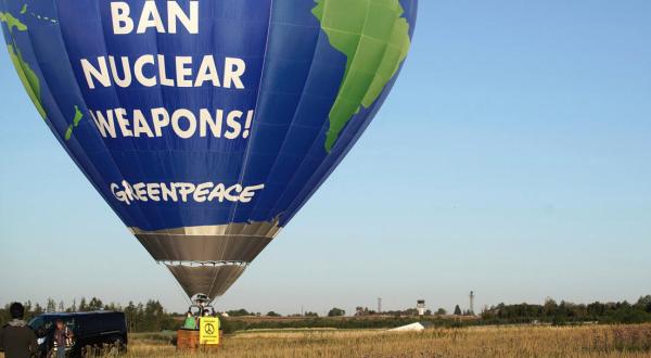 Die japanische Stadt Hiroshima und der beschauliche Ort Büchel haben auf den ersten Blick nichts miteinander gemein. Doch wer genauer hinschaut, sieht ein verbindendes Element, das jede Beschaulichkeit verschwinden lässt: US-amerikanische Atombomben. Morgen vor 75 Jahren – am 6. August 1945 – wurde die weltweit erste Atombombe auf Hiroshima abgeworfen. Am 9. Oktober folgte die zweite Atombombe auf Nagasaki. Die Bombenabwürfe forderten mehr als 200.000 Todesopfer und sollten als eine der markantesten Gräueltaten in die Geschichtsbücher eingehen, die sich nie wiederholen dürfen. Was viele nicht wissen: In Büchel lagern noch heute mutmaßlich 20 US-amerikanische Atombomben. Diese sollen im Rahmen der erweiterten nuklearen Teilhabe von deutschen Piloten ins Ziel geflogen werden – ein Missstand, den Aktivistinnen und Aktivisten von Greenpeace nicht hinnehmen wollen. Für den Abzug aller US-amerikanischer Atombomben aus Deutschland protestieren sie heute am Fliegerhorst Büchel. „Atomwaffen abschaffen – ban nuclear weapons!“ fordern sie auf einem Banner an einem Heißluftballon. Dieser ist vor dem Gelände angebracht, auf dem laut Abrüstungsexperten und -Expertinnen US-amerikanische Atombombern lagern. Auf einem Banner unter dem Ballon steht: „Hiroshima – never again!“.