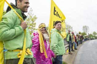6000 Menschen setzen mit einer Anti-Kohle-Demonstration im Rheinland ein Zeichen: Mit einer siebeneinhalb Kilometer langen Menschenkette am Braunkohletagebau Garzweiler II protestieren sie für den Kohleausstieg. Aufgerufen hatten Greenpeace, BUND und andere Umwelt- und Entwicklungsorganisationen.