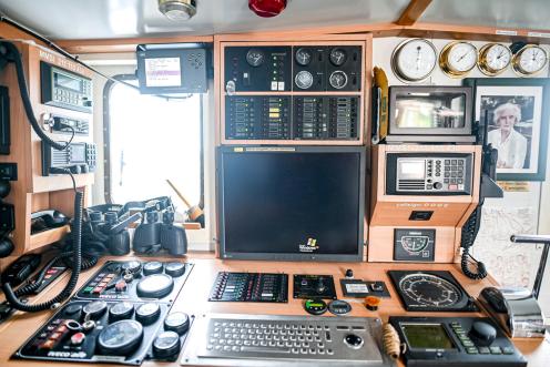 Innenansicht der Brücke oder Steuerraum der Beluga II. Rechts ein Gedenkbild von Ilse Vormann.