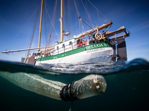 Beluga II auf dem Rhein: Wissenschaftler:innen untersuchen 2020 die Verschmutzung des Rheins mit Mikroplastik. Die Wasser- und Sedimentproben werden direkt in einem Labor im Schiff auf Mikroplastik hin analysiert.