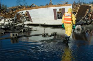 • Ein Greenpeace Kampaigner und Chemieexperte begutachtet die Folgen des Hurrikans Katrina 2005.