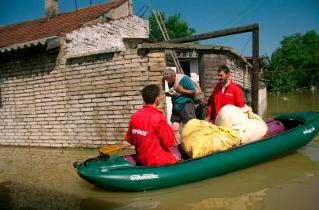 • Flutopfer in Tschechien 1997: Greenpeace Mitarbeiter:innen helfen bei der Evakuaierung mit Booten.