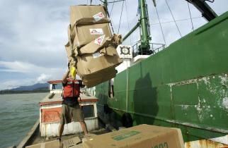 • Das Greenpeace-Flaggschiff Rainbow Warrior II entlädt Hilfsgüter für die Organisation "Ärzte ohne Grenzen" (MSF) in Indonesien