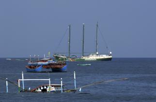 • Die Rainbow Warrior II vor der Küste Indonesiens: Das Greenpeace-Schiff bringt dringend benötigte medizinische Hilfsgüter und Nahrungsmittel für die Ärzte ohne Grenzen (MSF) nach Meulaboh an der Westküste der Provinz Aceh, Sumatra.