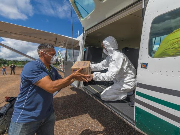“Wings of Emergency-Projekt” in Brasilien 2020 - ein Greenpeace Mitarbeiter nimmt Covid-Hilfsgüter aus einem Flugzeug entgegen