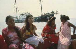 Evakuierung der Inselbewohner von Rongelap nach Mejato durch die Rainbow Warrior. Rongelap wurde durch den radioaktiven Fallout der US-Atomtests zwischen 1946 und 1958 verseucht. Viele Bewohner, darunter Kinder leiden unter Gesundheitsschäden. Die Greenpeace-Crew hat Erwachsene, Kinder und 100 Tonnen Habseligkeiten an Bord genommen.