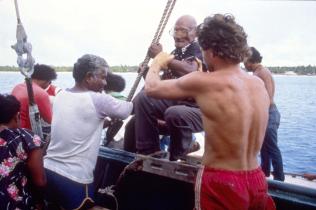 Der Fotograf Fernando Pereira (rechts) und die Rongelap-Insulanerin Bonemej Namwe. Die Rainbow Warrior I ist in Rongelap, um bei der Evakuierung der Inselbewohner nach Mejato zu helfen. Rongelap wurde 1954 durch nuklearen Fallout verseucht - die Bewohner der Insel verlieren ihre Heimat.