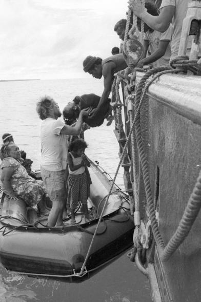 Mai 1985: Die Greenpece Crew hilft den Menschen an Bord während der Evakuierung der Rongelap-Insulaner nach Mejato.