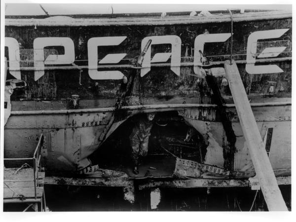 Um 23.38 Uhr zündet die erste Bombe. Ein Schlag erschüttert die Schiffsmesse, die Männer werden aus ihren Sitzen geschleudert, das Schiff schwankt bedrohlich. „Das war im Maschinenraum“, schreit Davy Edward. Der Bordingenieur hastet los, um den Schaden festzustellen. Der Anblick macht ihn fassungslos. Durch ein garagentorgroßes Loch in der Schiffswand schießt Wasser ins Innere der Rainbow Warrior. Binnen Sekunden neigt sich das Schiff zur Seite. „Alle von Bord“, befiehlt Kapitän Peter Willcox. Der Schweizer Schiffsarzt Andy Biedermann und andere Crewmitglieder kontrollieren geistesgegenwärtig alle Kabinen. Aus einer befreien sie Margret Mills. Die Schiffsköchin ist fast orientierungslos, weil sie im Chaos ihre Brille nicht finden kann.