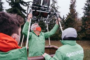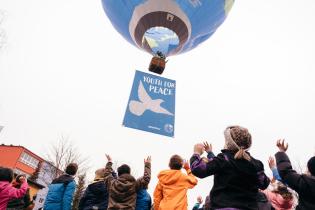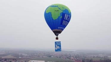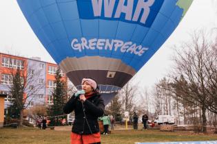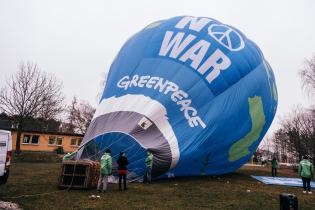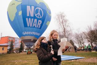 Unter diesem Motto haben am 17. März 2022 mehr als 200 Schüler:innen von einem Schulhof in Oberdorla in Mitteldeutschland einen Heißluftballon verabschiedet. In Gestalt einer Weltkugel mit einem große Banner, auf dem eine Friedenstaube abgebildet war, stieg der Greenpeace Ballon in den Himmel. Mit an Bord waren auch drei Greenpeace-Jugendliche.