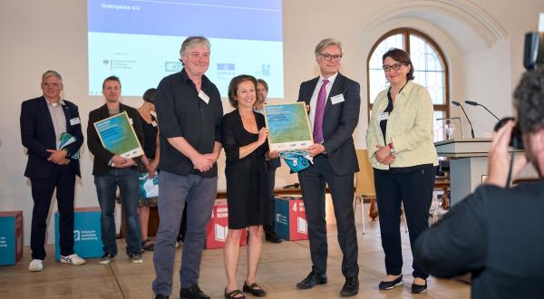 Die Freude war groß am Abend des 16. Juni im Münchner Rathaus: Das Bundesministerium für Bildung und Forschung (BMBF) und die Deutsche UNESCO-Kommission vergaben an Greenpeace Deutschland die „Nationale Auszeichnung – Bildung für nachhaltige Entwicklung (BNE)“ für das hochwertige Bildungsangebot der Organisation (Foto: Roman Luckscheiter, Generalsekretär der Deutschen UNESCO-Kommission, und Dr. Andrea Ruyter-Petznek, Referatsleitung Bildung in den Regionen, BNE, BMBF, überreichen die Auszeichnung an Dietmar Kress und Stephanie Weigel aus dem Greenpeace Bildungsteam).