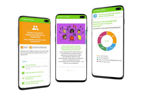 Das Bildungsmaterial „Demokratie im Krisenmodus?“ ist eine 90 bis 180 Minuten umfassende Unterrichtssequenz. Sie ist vollständig digital und kann im Präsenzunterricht, per Videokonferenz oder in hybriden Settings eingesetzt werden. Die Schüler*innen tauschen sich über die Corona-Krise aus und diskutieren ihre negativen wie positiven Auswirkungen auf Mensche, Gesellschaft und Demokratie. Darauf aufbauend entwickeln sie Zukunftsperspektiven und erkunden Handlungsoptionen zur Mitgestaltung der Zukunft.