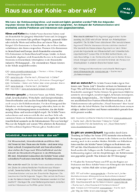 Bei dem Unterrichtsmaterial „Raus aus der Kohle – aber wie?“ handelt es sich um eine zweiseitige Sonder-Einlage des Greenpeace-Bildungsmaterials „Klimaschutz und Klimapolitik - Alles Verhandlungssache?“. Auf der ersten Seite von „Raus aus der Kohle – aber wie?“ finden Sie Impulse für den Unterricht, mit deren Hilfe Sie die Debatte um den Kohleausstieg im Unterricht aufgreifen können. Dabei stehen insbesondere die unterschiedlichen Positionen innerhalb der Kohlekommission (aber auch innerhalb der Bevölkerung) im Vordergrund. Neben kurzen Hintergrundinformationen mit weiterführenden Links sind in den Materialien zahlreiche Vorschläge zur vielfältigen, multiperspektivischen und multimedialen Auseinandersetzung mit dem Thema enthalten.