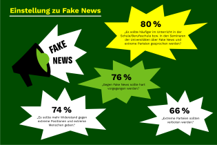 Laut den Umfrageergebnissen wünschen sich 80 Prozent der jungen Menschen in Deutschland eine intensivere Beschäftigung mit dem Thema Falschnachrichten im Unterricht und in Seminaren. Über 70 Prozent wünschen sich ein härteres Vorgehen in Bezug auf Fake News. 66 Prozent sind zudem der Ansicht, dass extreme Parteien verboten werden sollten.