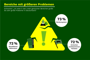 Die befragten Personen im Alter zwischen 16 und 25 Jahren sehen als größte Probleme: das Rentensystem (73 Prozent), ausreichend bezahlbarer Wohnraum (72 Prozent), Erstarken von rechtsextremen Parteien (72 Prozent) und Klimawandel (69 Prozent). Das in der Öffentlichkeit und Politik so viel thematisierte Thema "Flüchtlingspolitik" kommt mit 44 Prozent deutlich weiter hinten.